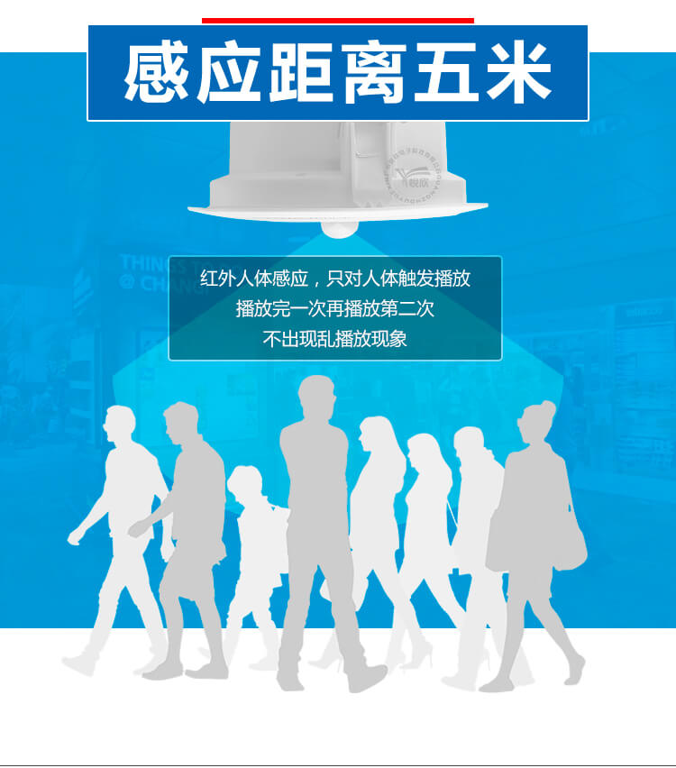 此紅外感應(yīng)喇叭還可以自由更換語(yǔ)音內(nèi)容,自己更換聲音,簡(jiǎn)單方便。感應(yīng)距離達(dá)5米遠(yuǎn),聲音大小也可調(diào)節(jié)。