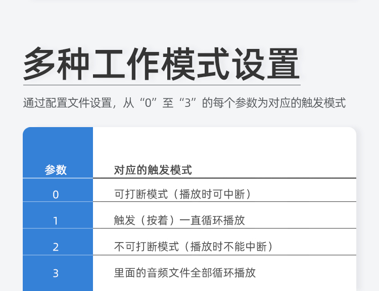 播放模式:上電響一次/上電循環(huán)響/曲目大循環(huán)